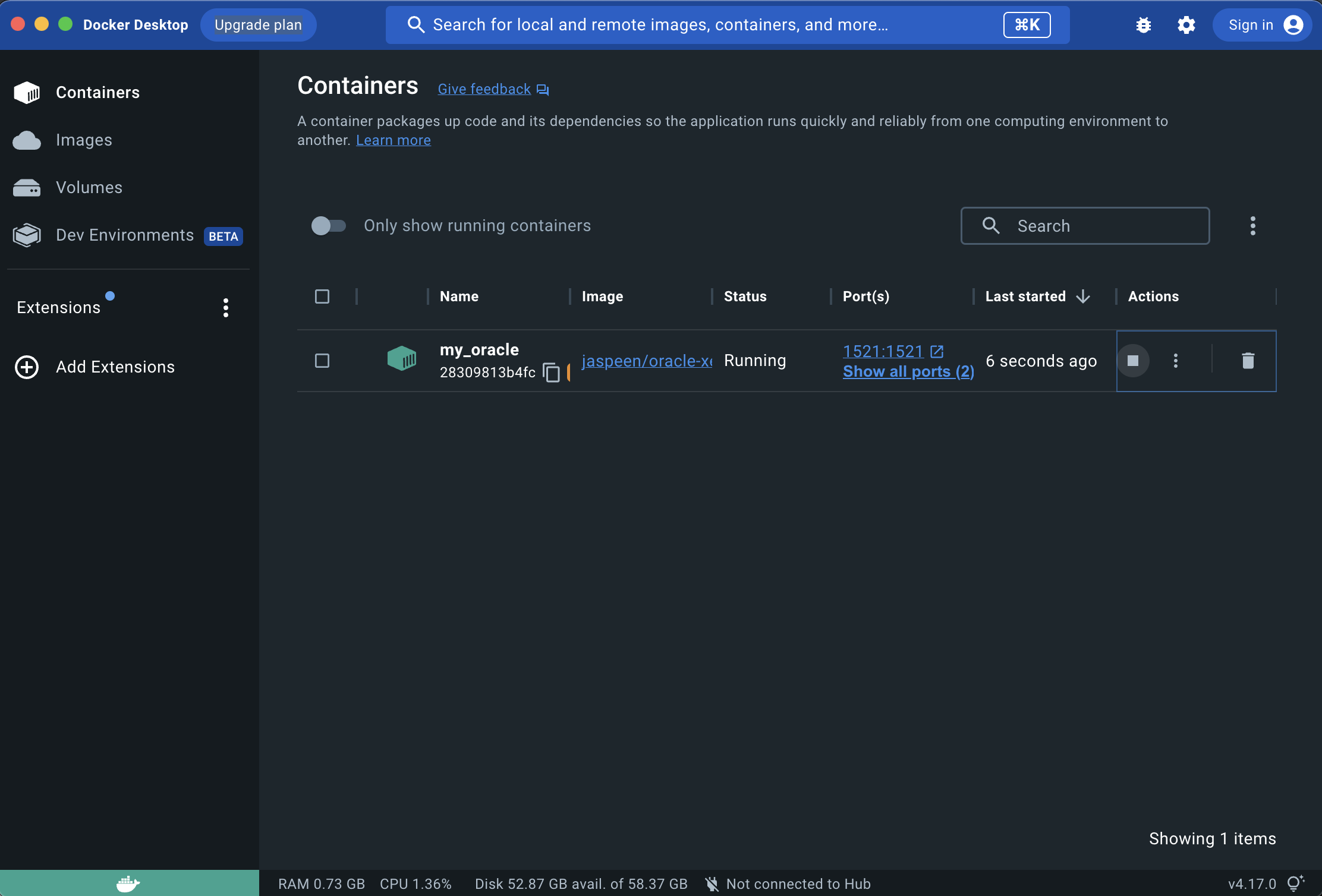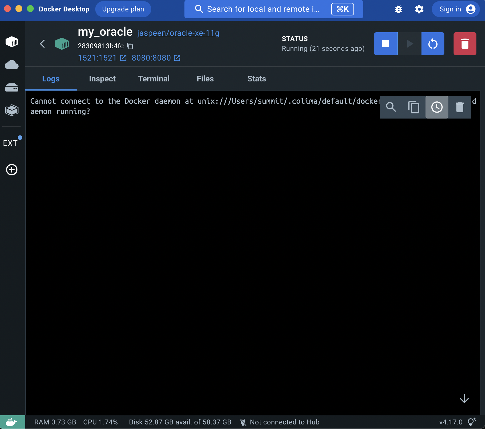 colima를 사용하지 않고 Docker Desktop 환경에서는 oc-oracle-xe 이미지로 컨테이너를 띄웠을 때 아키텍처가 달라 문제가 되었는데, 그걸 colima가 해결해준다.